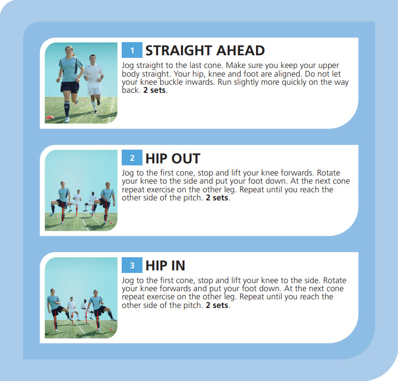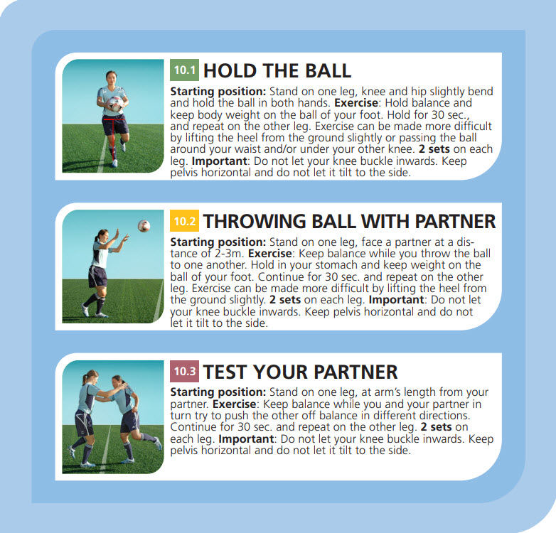 Uuteen tasoon siirrytään, kun edellisen tason harjoitteet onnistuvat hyvin ohjeistuksen mukaisilla toista ja sarjamäärillä. Harjoitusohjelmaa suositellaan toteutettavaksi ennen jokaisia harjoituksia tai ainakin vähintään kaksi kertaa viikossa toteutettavaksi. Lisäksi suositellaan, että harjoitusohjelmasta suoritetaan osat yksi ja kolme ennen jokaista peliä. (Bizzini ym.)
