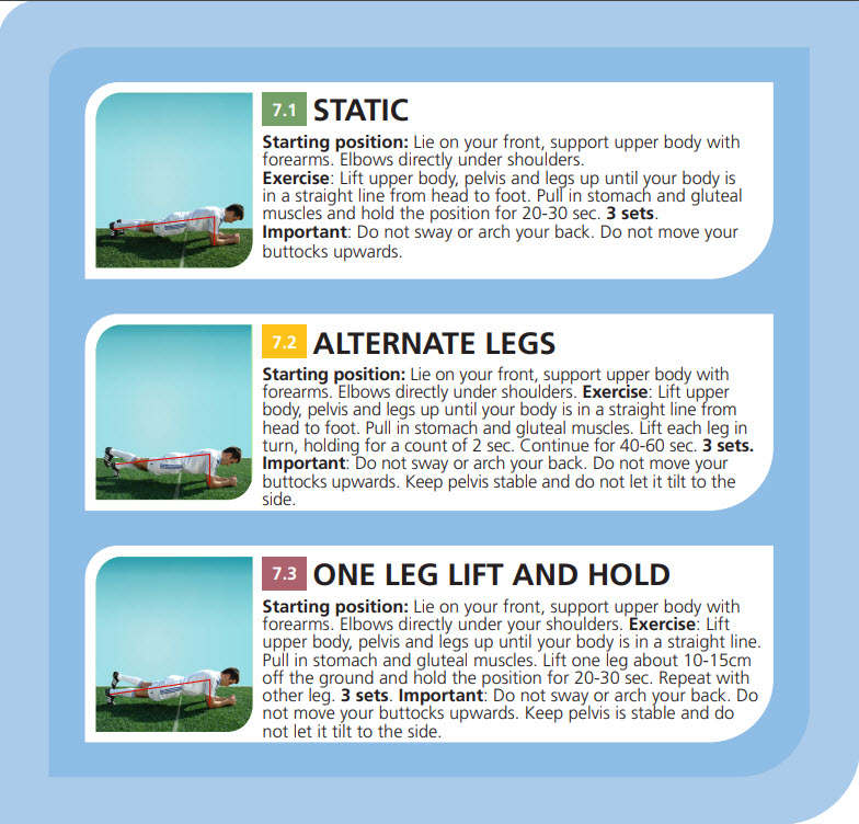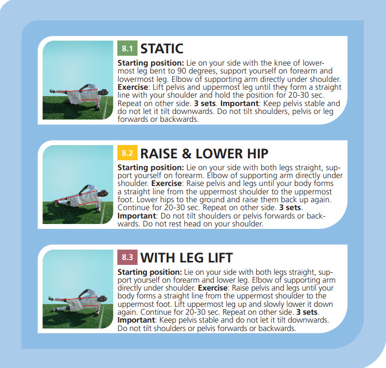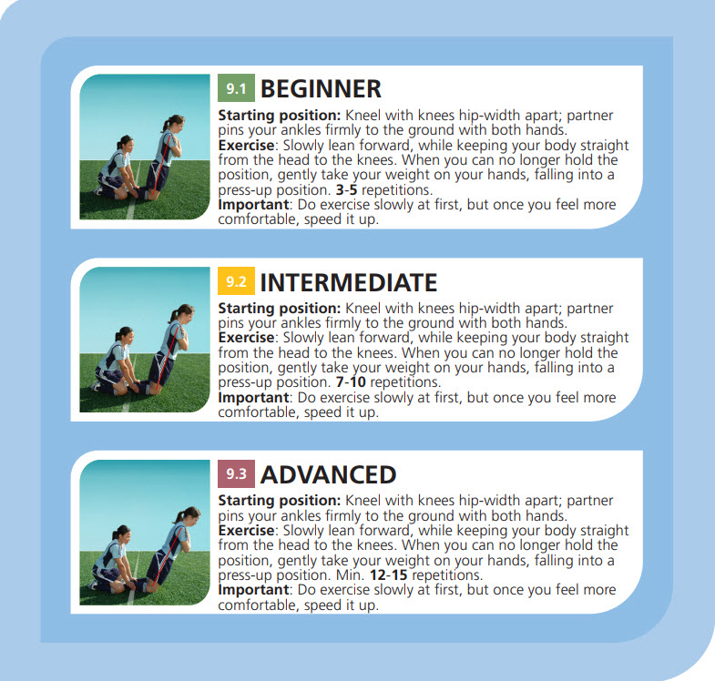 Uuteen tasoon siirrytään, kun edellisen tason harjoitteet onnistuvat hyvin ohjeistuksen mukaisilla toista ja sarjamäärillä. Harjoitusohjelmaa suositellaan toteutettavaksi ennen jokaisia harjoituksia tai ainakin vähintään kaksi kertaa viikossa toteutettavaksi. Lisäksi suositellaan, että harjoitusohjelmasta suoritetaan osat yksi ja kolme ennen jokaista peliä. (Bizzini ym.)