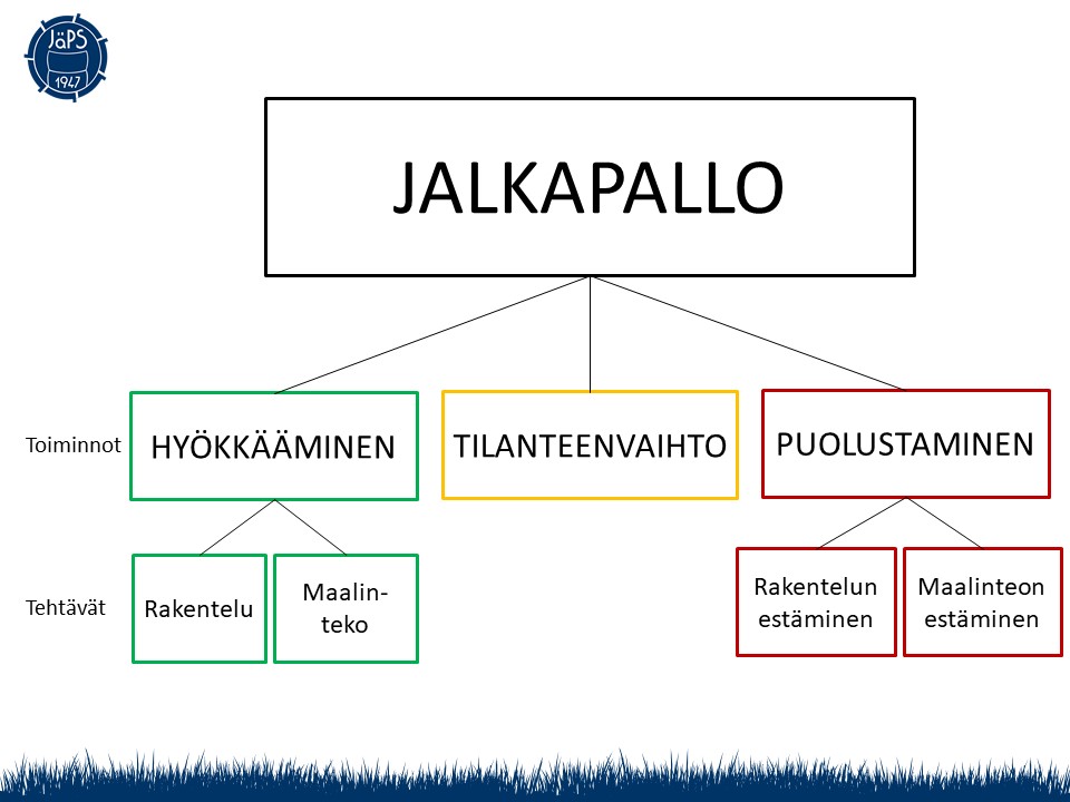 Verheijen mukaan jalkapallo koostuu kolmesta joukkueen toiminnosta: Hyökkääminen, Tilanteenvaihto ja Puolustaminen. Hyökkääminen on sarja toimintoja, joita joukkue tekee vain silloin kun sillä on pallo hallussaan ja tarkoituksenaan on tehdä maali. Joukkueen toiminta "hyökkääminen" on kuitenkin paljon laajempi kuin pelkkä maalin tekeminen. "Hyökkääminen" alkaa usein maalivahdilta ja periaatteessa kaikki muut pelaajat voivat antaa siihen panoksensa. Tästä syystä on järkevää jakaa "Hyökkääminen" kahteen vaiheeseen: 1. Rakentaminen (mahdollisuuksien luomiseksi) ja 2. "Maalin tekeminen" (mahdollisuuksien muuttaminen maaleiksi). Näitä vaiheita kutsutaan joukueen tehtäviksi. Myös puolustaminen on koko joukkueen tehtävä, koska se voi alkaa jo läheltä vastustajan maalia. Tästä syystä puolustaminenkin on jaettu kahteen tehtävään: 1. "Rakentelun häiritseminen (mahdollisuuksien estäminen) ja 2. Maalienteon estäminen. Hetkeä jolloin pallo voitetaan tai menetetään, kutsutaan tilanteenvaihdoksi, koska molemmat joukkueet ovat tilapäisesti epäorganosoituja ja joukkueiden on järjestäydyttävä hyökkäyksesätä puolustukseen tai puolustuksesta hyökkäämiseen.